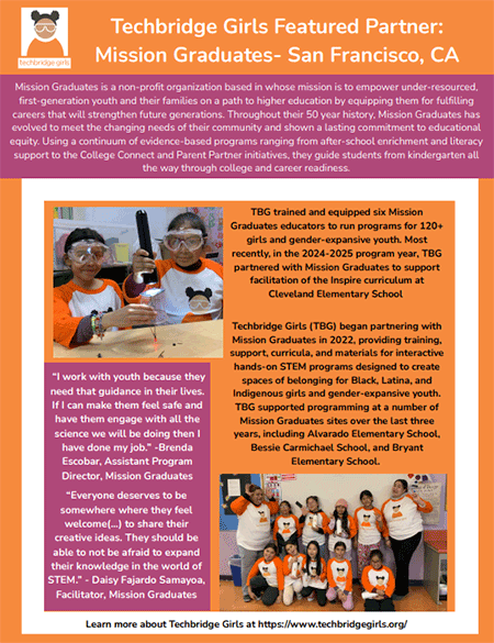 For more than 50 years, Mission Graduates has been a cornerstone of educational equity in San Francisco, empowering first-generation and under-resourced youth to reach college and career success. Since 2022, Techbridge Girls has proudly partnered with Mission Graduates to bring equity-centered STEM learning to girls and gender-expansive youth across multiple school sites. Together, we’re cultivating educators and mentors who create spaces of belonging—like Brenda Escobar and Daisy Fajardo Samayoa, whose leadership and care inspire students to explore, persist, and dream big. This partnership exemplifies how community-rooted collaboration can transform access and opportunity in STEM for generations to come.